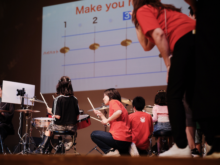 後半もドラム体験が続きます!子どもたちに大人気の曲ということもあり、次々と体験希望の子どもたちがステージに登場し、リズムを刻むたびに歓声が上がります。