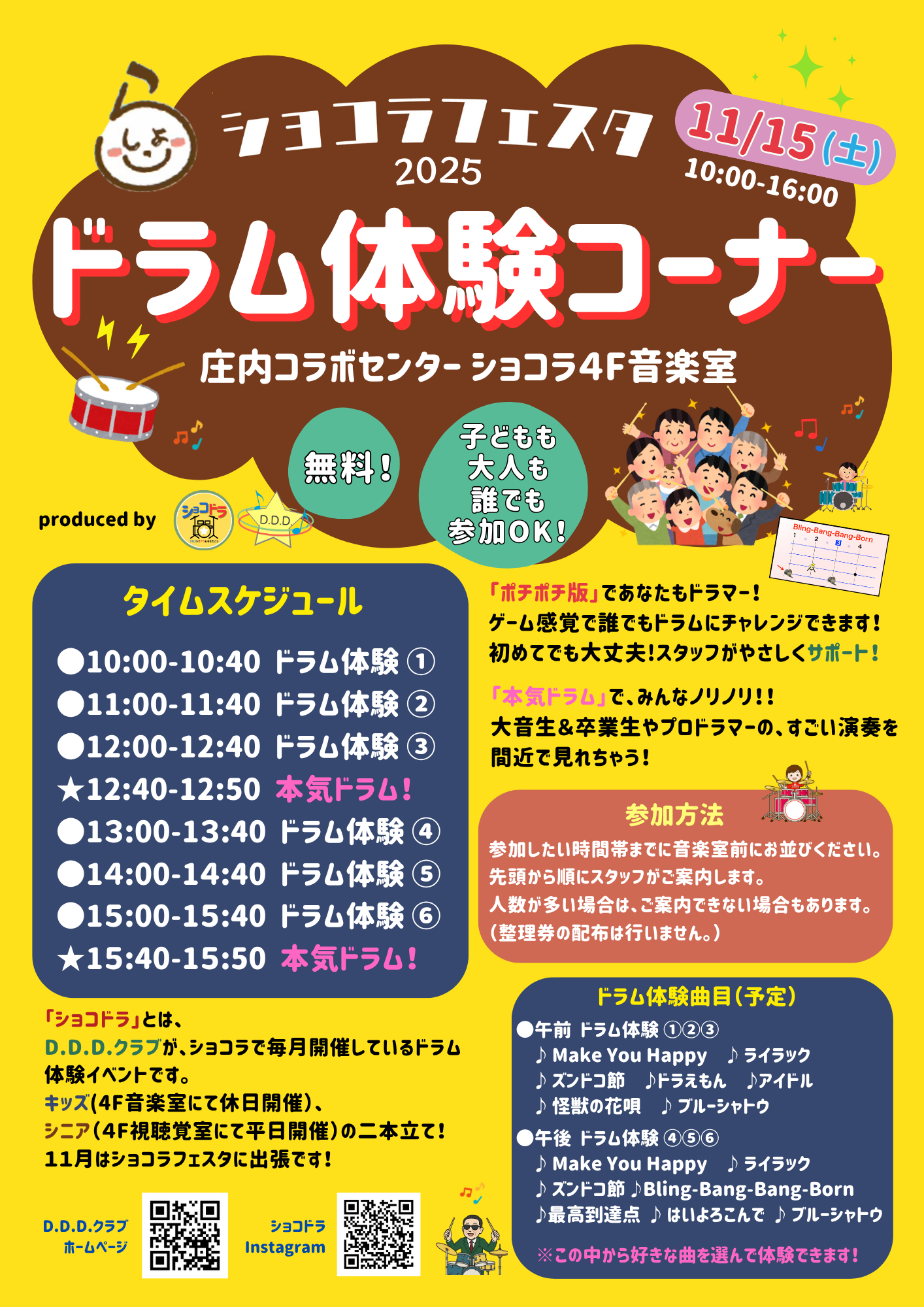 11月15日(土)は、「ショコラフェスタ2025」で、ショコドラ!ドラム体験!誰でもチャレンジできます(^_^)/ *画像更新11/5 23:30