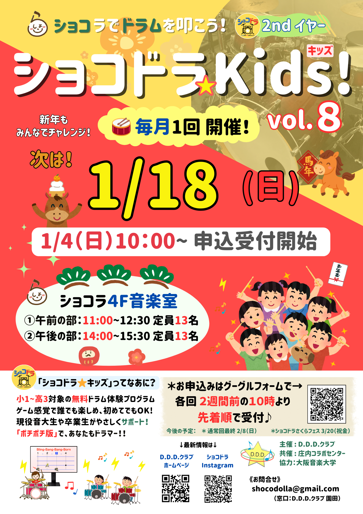 【ご案内】新年もドラムにチャレンジしよう♪「ショコドラKids! vol.8(1/18に開催)の申込受付は!1/4(日)10:00 スタート!