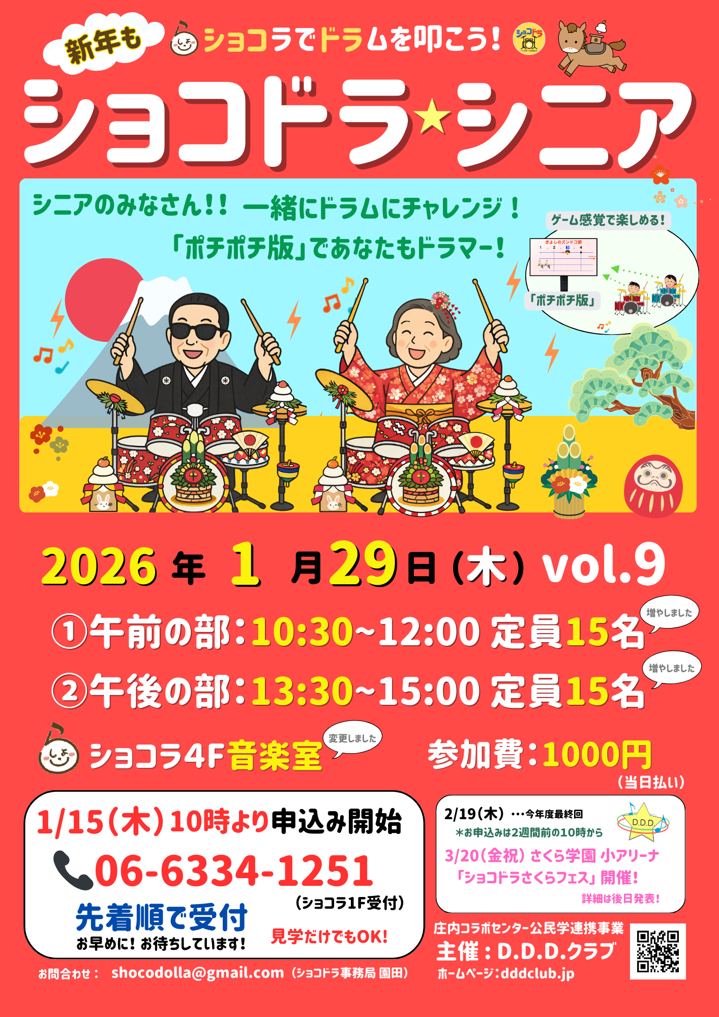 **新年もショコラでドラムを叩こう!***🎵 「ショコドラ★シニア」vol.9は1/29(木)開催!申込みは1/15(木)10:00〜